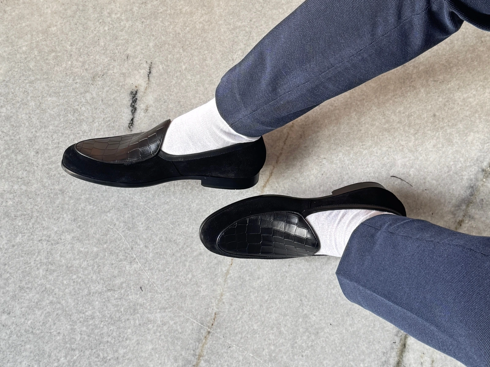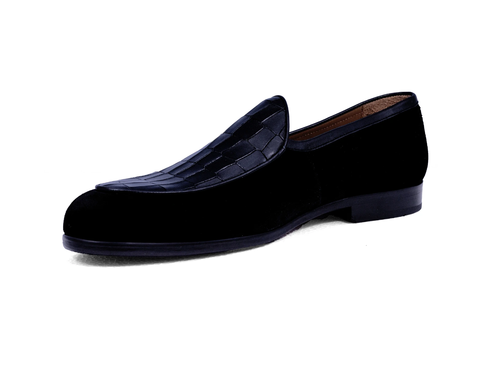 Where luxurious texture meets timeless Belgian craftsmanship — the CARRINGTON Black Belgian Loafers bring a sophisticated fusion of premium materials and refined design. Handcrafted using imported black suede paired with croco-printed leather, this standout combination adds depth, contrast, and an elevated modern character to the classic Belgian silhouette.